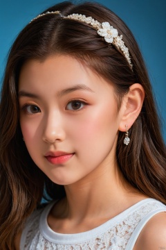 1girl, solo, looking at viewer, smile,  brown hair,  brown eyes, jewelry, closed mouth, upper body, earrings, lips, blue background, portrait, realistic, nose, jiaxin
