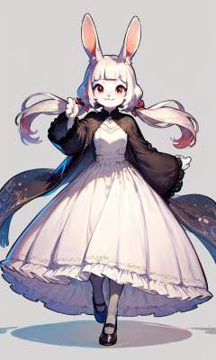 (score_9, score_8_up, score_7_up),(furry female),(rabbit girl),blunt bangs,low twintails,puffy twintails,(long dress),white skirt,black shawl,grey pantyhose,black shoes,dynamic pose,cowboy shot,light smile,(simple background:1.5),(uncensored),