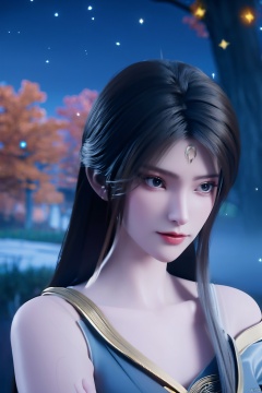 1girl, solo, long hair, black hair, hair ornament, dress, jewelry, outdoors, hair bun, white dress, tree, night, single hair bun, light,Xtianhuxiaobai