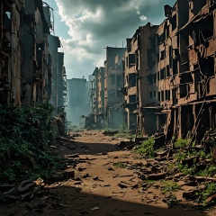 a desolate city, abandoned buildings, crumbling architecture, decaying infrastructure, overgrown vegetation, post-apocalyptic atmosphere, dramatic lighting, moody color palette, cinematic composition, (best quality,4k,8k,highres,masterpiece:1.2),ultra-detailed,(realistic,photorealistic,photo-realistic:1.37),dramatic shadows, gloomy sky, decrepit streets, rusting metal, shattered windows, dust and debris, sense of isolation, haunting ambience, atmospheric haze, melancholy tone, forgotten civilization