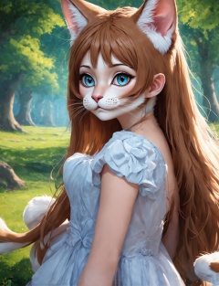 a beautiful anime girl, cat girl, with long hair, detailed facial features, piercing blue eyes, sharp cat-like ears, delicate facial expression, elegant pose, intricate dress, flowing fabric, detailed fur on cat ears and tail, (best quality,4k,8k,highres,masterpiece:1.2),ultra-detailed,(realistic,photorealistic,photo-realistic:1.37),detailed background, lush forest, magical forest clearing, soft lighting, warm color palette, cinematic composition