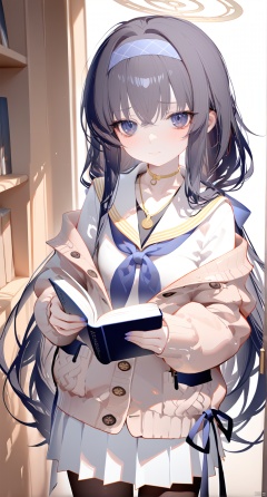 ,1girl,solo,(masterpiece:1.3),( beautiful:1.2),(high quality:1.2),(finely detailed:1.2),extremely detailed CG unity 8k wallpaper,best quality,a very delicate and beautiful,perfect fingers,(one cute girl at the center:1.2),high_res, long hair, bangs, blue eyes, skirt, black hair, long sleeves, ribbon, hair between eyes, twintails, very long hair, school uniform, hair ribbon, pleated skirt, hairband,serafuku, sailor collar, neckerchief, book, low twintails, halo, white skirt, cardigan, long skirt, white sailor collar, bags under eyes, blue hairband, white serafuku, ui\(bluearchive\), long dress,black pantyhose,indoors,libary,standing, cowboy_shot, shy, blush, closed_mouth, uiBA,