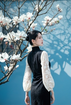 Photograph, elegant woman in a black qipao with white lace sleeves, side profile, serene expression, hair in a bun, soft natural light, blooming magnolia tree in the background, muted blue wall, calm and contemplative mood, traditional Chinese attire, delicate and graceful composition.