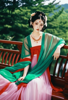 photograph Photograph, elegant woman in traditional Chinese attire, Tang dynasty, sitting on a wooden bench, wearing a flowing pink and red hanfu, pearl necklace, intricate hair ornaments, serene expression, lush green background, soft natural lighting, poised and graceful pose, cultural and historical ambiance., 50mm . cinematic 4k epic detailed 4k epic detailed photograph shot on kodak detailed cinematic hbo dark moody, 35mm photo, grainy, vignette, vintage, Kodachrome, Lomography, stained, highly detailed, found footage