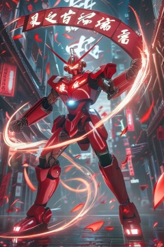 magic effect, Surrounded by rotating transparent red scrolls, floating transparent red Chinese characters, dynamic, rotating, 1 man standing in the air, not looking at the camera, writing calligraphy, solo, blue eyes, holding, weapon, holding weapon, glow, robot, mecha, science fiction, open_hand,v-fin, movie lighting, strong contrast, high level of detail, best quality, masterpiece