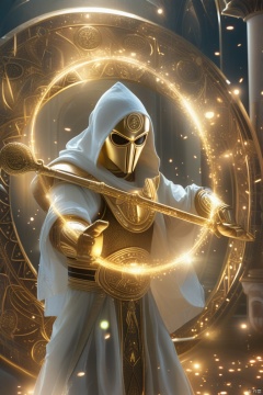 God Light, Moon Knight holding a glowing golden scepter in hands standing inside a glowing golden magic circle, glowing golden color tone, highly detailed, ultra-high resolutions, 32K UHD, best quality, masterpiece,