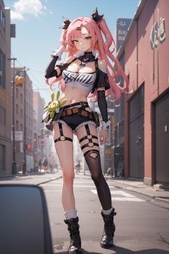 <lora:Nicole-000010:1>,Nicole CYQL,1girl,looking at viewer,solo,long hair,pink hair,hair ribbon,black ribbon,two side up,hairclip,mole under eye,green eyes,bare shoulders,shoulder cutout,large breasts,mole,strapless,tube top,cleavage,long sleeves,midriff,crop top,cutoffs,black shorts,single thighhigh,clothing cutout,belt,thigh strap,socks,black footwear,boots,grin,portrait,Historic district in European city, Cobblestone streets, Architecture, Heritage,beautiful detailed sky,beautiful detailed glow,posing in front of a colorful and dynamic background,masterpiece,best quality,beautiful and aesthetic,contrapposto,female focus,wallpaper,
