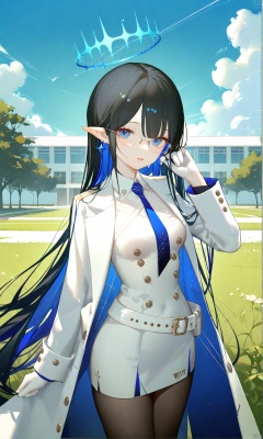 parted lips ,outdoors, blue sky,sunlight, clouds, school building,lawn, blue halo,