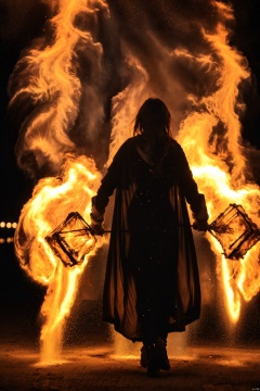 (masterpiece),(best quality),ultra detailed,hdr,a girl,HUOHU art,fire,Black background,at night,