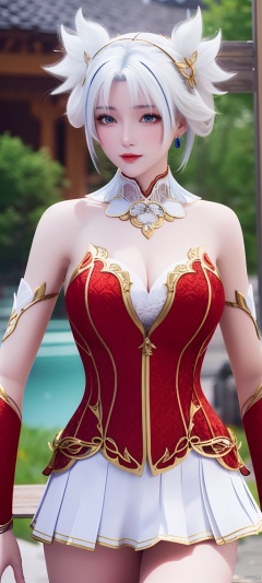 3D,masterpiece,(best quality),official art, extremely detailed cg 8k wallpaper,((crystalstexture skin)), (extremely delicate and beautiful),(highly detailed), qinger, 1girl, (red upper garment:1.4), (white short skirt:1.2), (white_hair:1.2) , solo, looking at viewer, cowboy_shot, realistic,masterpiece,best quality