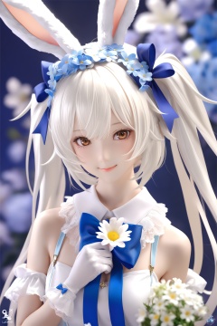 masterpiece, Realism, best quality, loli, 1girl, animal ears, solo, flower, gloves, rabbit ears, white gloves, white hair, hair ornament, dress, looking at viewer, hair flower, white dress, twintails, blurry background, hair between eyes, bow, upper body, white flower, fake animal ears, brown eyes, official alternate costume, lips, blue flower, blue bow, bowtie, ribbon, dutch angle, long hair, breasts, closed mouth, laffey (azur lane), realistic, smile, signature, blue ribbon, bouquet, head tilt, artist name