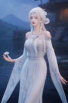 (masterpiece,best quality),1girl, solo, long hair, (big breasts:1.69), looking at viewer, dress, bare shoulders, jewelry, white hair, earrings, detached sleeves, wings, necklace, white dress, lips, tiara,Xtianhuxiaobai,Maple leaves, flowers,waterfalls, volcanoes,