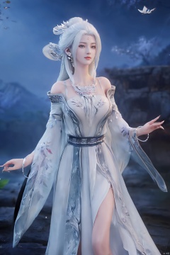 (masterpiece,best quality),1girl, solo, long hair, (big breasts:1.69), looking at viewer, dress, bare shoulders, jewelry, white hair, earrings, detached sleeves, wings, necklace, white dress, lips, tiara,Xtianhuxiaobai,Maple leaves, flowers,waterfalls, volcanoes,