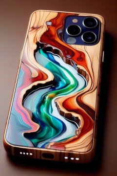 A photorealistic image of a cellphone made from epoxy resin and timber, concept fusion piece, vibrant colour resin, fluid dynamic, flowing, exotic timber, detailed background, no humans, still life, reflection, shadow, water effect, AAr3s1nfl0w