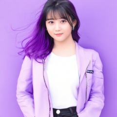 1girl with purple hair and black hair wearing a white top and purple jacket standing in front of a purple background,photo r3al