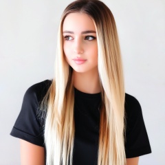 photo r3al 1girl solo long hair shirt blonde hair brown hair closed mouth upper body multicolored hair short sleeves mole two-tone hair black shirt looking to the side grey eyes lips t-shirt realistic mole on neck photorealistic