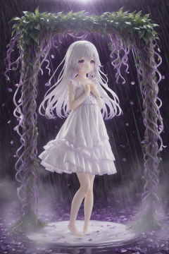 masterpiece,Realism,best quality,PVC Style:2,loli,white background,Dundar effect,a lot of purple vines,vines covering half of the painting,delicate plant details,a girl,girl,petite girl,long white hair,golden pupils,white dress,bare feet,side,side,upper body,head up,sad eyes,rain,light,figure light,petals,purple filter,left,fog,dream,unreal,Blur,float light,, <lora:HANS-PVC22-000021:1>