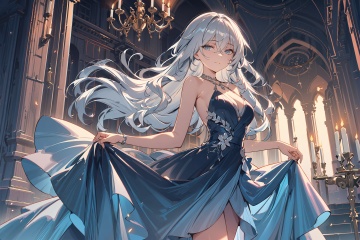 line art,line style,1girl,solo,blue eyes,white hair,long hair,hair between eyes,cleavage,medium breasts,silver halter dress,necklace.halterneck,evening gown,cowboy shot,light smile,half-closed eyes,looking at viewer,skirt_hold,gothic architecture,Industrial wind,window_,sash,curtains,indoor,castle,chandelier,candlestand,masterpiece,bestquality,onnk,