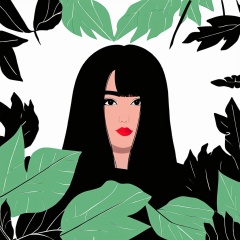 Flat Illustration, Flat Art Style, illustration of a woman peeking out from behind a leafy plant in front of a black and white background, 1girl, long hair, looking at viewer, simple background, black hair, white background, black eyes, makeup, portrait, lipstick, red lips