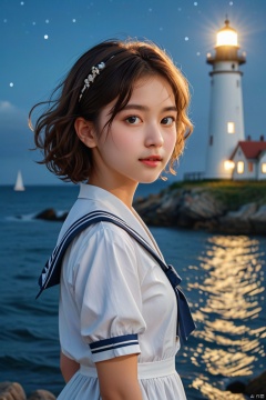 1girl, solo, looking at viewer, short hair, brown hair, dress, closed mouth, standing, short sleeves, outdoors, sky, puffy sleeves, sailor collar, water, white dress, blurry, from side, lips, night, star \(sky\), night sky, sailor dress, curly hair, realistic, lighthouse