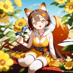 1girl, fox girl, izuna \(blue archive\), virtual youtuber, solo, textured skin, best quality, upper body, looking at viewer, holding flower, blush, animal ear fluff, fox tail, fox ears, open mouth, yellow eyes, eyeshadow, brown hair, short hair, sunflower hair ornament, hairband, medium breasts, striped bikini, visor cap, scarf, halo, fang, fox shadow puppet, yellow rose, orange flower, :d
