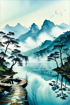 A serene misty morning in a tranquil Chinese landscape, with rolling hills of emerald green and wispy clouds drifting lazily across a cerulean sky. A winding path meanders through the lush vegetation, disappearing into the fog-shrouded mountains in the distance. In the foreground, a delicate willow tree bends towards the water's edge, its slender branches reflected perfectly in the still pond.