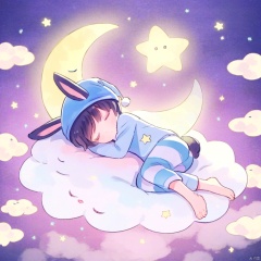 可爱水彩插画头像_烟上月,图像中展示了一个年幼的角色,可能是一个孩子,正在睡觉。这个角色有着大大的耳朵,类似兔子,穿着一件蓝色带有星形图案的睡衣。他们正躺在一个云彩上,这个云彩也被描绘成一个柔软的、梦幻般的存在,同样有星形图案。背景是深紫色的夜空,点缀着小星星和一个明亮的月亮,暗示着一个夜晚的场景。整体的色调以蓝色和紫色为主,营造出宁静而奇幻的氛围。