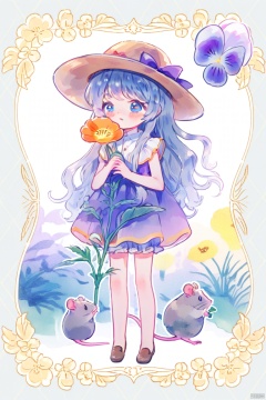 可爱水彩插画头像_烟上月,图像描绘了一个动漫风格的角色,具有独特的特征。这个角色有着长长的波浪蓝色头发,戴着一顶带蝴蝶结的宽檐帽,穿着一件无袖上衣和及膝裙子。服装颜色搭配是紫色和粉色的混合。角色的眼睛很大,表情柔和。他们手持一朵大的三色堇花,暗示着与植物或自然的联系。在背景中,有一个小巧的老鼠形象,给人一种伴侣关系或伙伴关系的感觉。整个画面被华丽的边框所包围,边框内有花卉图案,增添了作品的奇幻氛围。