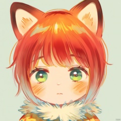 可爱水彩插画头像_烟上月,这幅图像是一幅数字插画,描绘了一个拥有人类特征和动物耳朵的角色。这个角色有着红色头发,带有一丝橙色的光泽,眼睛是绿色的,给人一种大而富有表现力的外观。耳朵尖尖的,类似狐狸,这与角色头部的圆形形状形成对比。角色穿着一条颈圈,上面有蓝色和黄色的图案,暗示着一种动物主题或服饰。背景是纯净的浅色,没有任何额外元素,将注意力集中在角色身上。这幅艺术作品具有水彩般的质感,色彩柔和,给人一种温暖和亲切的感觉。