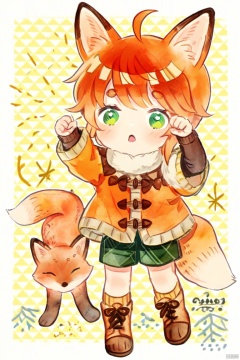 可爱水彩插画头像_烟上月,这幅图像展示了一个年轻的、风格化的角色,类似于人类和狐狸的结合体。这个角色有着橙色的尖耳朵,绿色的眼睛,和红棕色的毛发。他们穿着一件带有棕色装饰的橙色夹克,搭配绿色短裤,脚上穿着棕色鞋子。角色的表情是惊讶或兴奋的,他们正在举起一只手。背景中有一只小狐狸,暗示了与这个角色之间的联系。整个场景以黄色和白色为主题,给人一种温暖且略显奇幻的感觉。