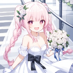 1girl, solo, long hair, breasts, looking at viewer, blush, smile, bangs, hair ornament, gloves, dress, bow, ribbon, holding, hair between eyes, bare shoulders, twintails, medium breasts, closed mouth, flower, white hair, frills, black gloves, hair flower, hair bun, white dress, double bun, black bow, rose, frilled dress, white flower, veil, pink flower, bouquet, stairs, wedding dress, skirt hold, bridal veil, white rose, pink rose, holding bouquet