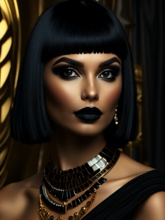 side profile pitcure of cleopatra, elaborate make up, straight-cut bob, elaborate black eyeliner, black hair, sumptous jewellery, cleavage, Perfect Composition, realistic photographic image, raw photo highest quality