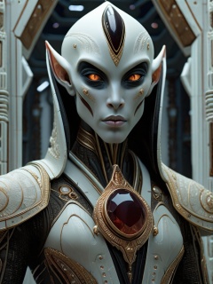 Fierce alien priest on an alien planet, styled with dark white and light bronze tones, adorned with gold filigree and gemstones (garnet, emerald, citrine, bloodstone). Standing in an ancient white marble temple, extremely detailed head and face, realistic and symmetrical eyes with eye contact, hyper-detailed and high quality, in the style of Brian Froud and Heather Theurer. Beautiful lighting, deep shadows, epic realism, meticulous masterpiece.
