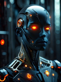 Close-up of a humanoid figure with a smooth face partially revealing intricate mechanical details beneath, glowing orange eye, and scattered sparks of light. Dark, moody background, blending human features with advanced technology