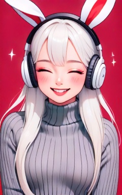 1girl, solo, long hair, blush, smile, simple background, animal ears, upper body, closed eyes, white hair, rabbit ears, sweater, fake animal ears, turtleneck, headphones, facing viewer, red background, ribbed sweater, turtleneck sweater