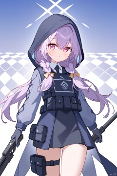 1girl, solo, long hair, looking at viewer, blush, simple background, gloves, hair between eyes, purple eyes, jacket, weapon, braid, hood, pink eyes, twin braids, gun, halo, pouch, holster, thigh holster, tactical clothes,white background, argyle background,atsukoBA