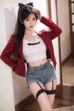 1girl, solo, long hair, breasts, looking at viewer, bangs, skirt, large breasts, shirt, black hair, thighhighs, bow, standing, jacket, full body, white shirt, ponytail, short sleeves, thighs, parted lips, shorts, midriff, collared shirt, artist name, black thighhighs, indoors, bowtie, black footwear, arm up, high heels, crop top, parted bangs, black bow, garter straps, thigh gap, red jacket, cropped jacket, black bowtie
