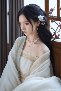 masterpiece,best quality,high quality,normal quality,1girl,upper body,solo,Off Shoulder,hanfu,dress,curtains,jewelry,long hair,black hair,white dress,earrings,looking to the side,branch,expressionless,flower,closed mouth,hair ornament,window,necklace,realistic,weibo logo,windowsill,