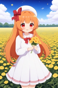 1girl, solo, long hair, looking at viewer, blush, bangs, red eyes, long sleeves, hat, dress, bow, holding, orange hair, flower, outdoors, sailor collar, white dress, red bow, white headwear, sailor dress, yellow flower, holding flower, field, flower field
