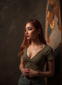 Indian beauty, sfw, cleavage,  masterpiece, high quality, hyper-realistic photography captured with the best camera, 3D, HDR, high definition, pore and detailed, intricate detailed, volumetric lights, cinematic lighting, vibrant color, cool actress, beautiful woman, 28 years old, sexy sfw, smirk, red hair, casual tight cotton clothing, hourglass body, luxury home,  wide hips, wide hips, wide hips, nice ass, thigh gap, crotch gap, crotch gap, photorealistic photo, huge size natural breasts, full body shot, head to thigh view, looking at viewer, (((thick, curvy body, big breasts))), fair smooth skin, in the style of jclive9988