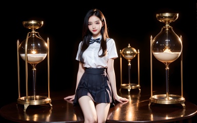 ((1 girl, 22 y.o, Masterpiece, best quality, cinematic lighting, 8k, full body shot, long hair, hourglass body)), (smile:0.85), (realistic background:1.2)<lora:SF_School_Dress_By_Stable_Yogi:0.8>black school uniform, bowtie, sailor collar, pleated skirt