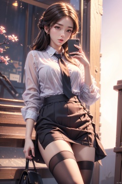 8K image., shinkai color,1girl, solo, long hair, skirt, shirt, thighhighs, holding, school uniform, purple eyes, white shirt, black hair, necktie, black thighhighs, bag, zettai ryouiki, phone, cellphone, smartphone, holding phone