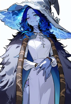 1girl, ranni the witch, shiro9jira, ciloranko, ask \(askzy\), (tianliang duohe fangdongye:0.8), white witch hat, blue ring, white dress, grey fur cloak, blue hair, blue eyes, one eye closed, blue skin, cracked skin, doll joints, extra arms, extra faces, colored skin, solo, witch hat, dress, cloak, fur cloak, long hair, hat, joints, masterpiece, best quality, newest, absurdres, nsfw, explicit <lora:Elden Ring-Ranni_v1.0:1>