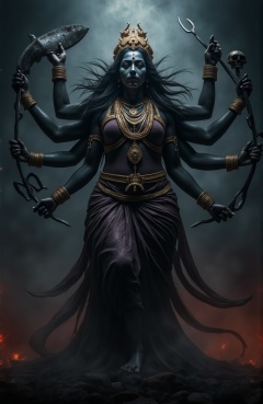 Kali Maa is adorned with gold and traditional ornaments, including necklaces, bangles, and anklets that gleam against her dark skin. Her attire is a traditional cracked saree, worn in a way that reveals her powerful and curvaceous form. Her hair is wild and dirty, flowing around her like a storm, adding to her fearsome presence.
