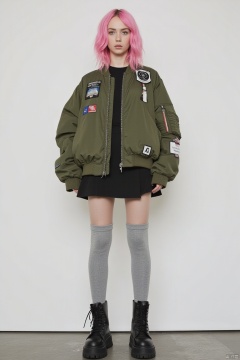 The image features a young woman standing against a plain,light background which helps to highlight her attire and pose. She has striking pink hair styled in loose waves that frame her face,which bears a serious,contemplative expression. Her outfit consists of a bulky,olive green bomber jacket,a black skirt peeking beneath it,and long,light gray knee-high socks that transition into chunky black combat boots. Her jacket is adorned with various patches and zippers,adding a touch of rugged urban fashion to her look. The contrasting styles—feminine hair and makeup with more masculine and oversized outerwear—create an eye-catching juxtaposition. The soft color palette of her hair and the vivid green of her jacket stand out starkly against the monochrome environment.,