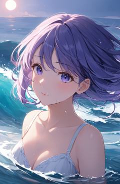 "Gentle anime art style, a serene portrait of a young woman with ethereal beauty, set against a background of swirling blue and purple waves. Her calm expression and delicate features are highlighted by the soft moonlight that illuminates the scene. The flowing water elements around her create a sense of peaceful movement, as if she is one with the ocean."