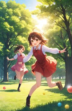 "Heartwarming anime art style, featuring a lively scene of students playing on a sunlit school playground. The breeze gently rustles through the trees, and the sound of laughter fills the air. The sunlight creates a soft, golden glow over the grass, capturing the joy and energy of youth in a simple, yet beautiful moment."