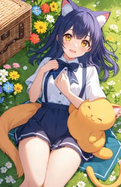 "Wholesome anime art style, showing a young girl lying on a picnic blanket on a sunny day, surrounded by flowers and a large-eyed cat. She is holding a plush toy close to her chest, with a gentle smile on her face. The scene is filled with the vibrant colors of nature, and the overall atmosphere is one of peace, contentment, and warmth."