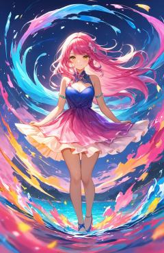 "Vibrant anime art style, showing a young girl with long, flowing hair in vivid shades of pink, blue, and yellow, standing in the midst of swirling water. Her dress appears to merge with the water, creating a dynamic flow of colors around her. The scene is bright and lively, with a surreal mix of vibrant hues creating a sense of movement and energy, as if she embodies the spirit of the water."