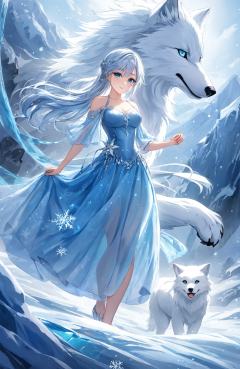 "Elegant anime art style, featuring a young girl with long, flowing silver hair standing confidently beside a giant white wolf in a frozen, mystical landscape. The girl is dressed in an intricate ice-blue gown, and her piercing blue eyes reflect the strength and wisdom of her companion. The scene is illuminated by a soft, ethereal glow, with snowflakes gently falling around them, emphasizing their bond as protectors of the frozen realm."